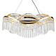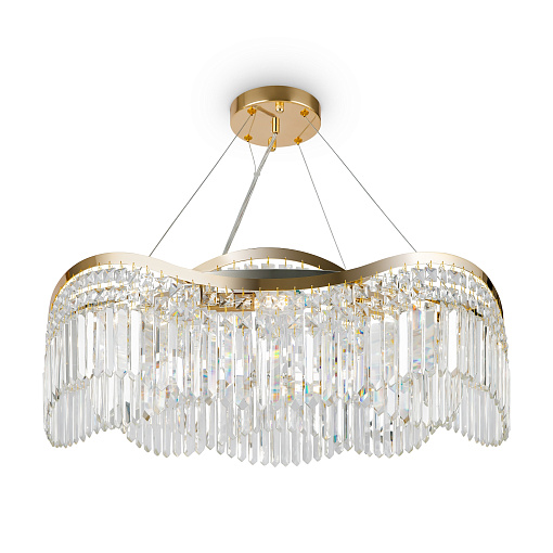 Металлическая арматура в золотом цвете. Декоративные подвески различной формы и огранки. Оригинальные волнообразные очертания светильника. Трендовый эффект парения. Ассортимент для общей и зональной подсветки.
