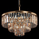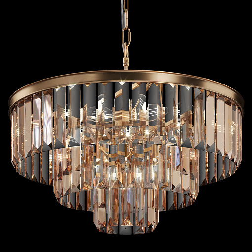 Арматура из металла в трех оттенках: латунь, хром, золото. Многоярусный декор. Подвески: прозрачное (арматура – хром, латунь) и янтарное (арматура – золото) стекло. Высота подвесных моделей регулируется.