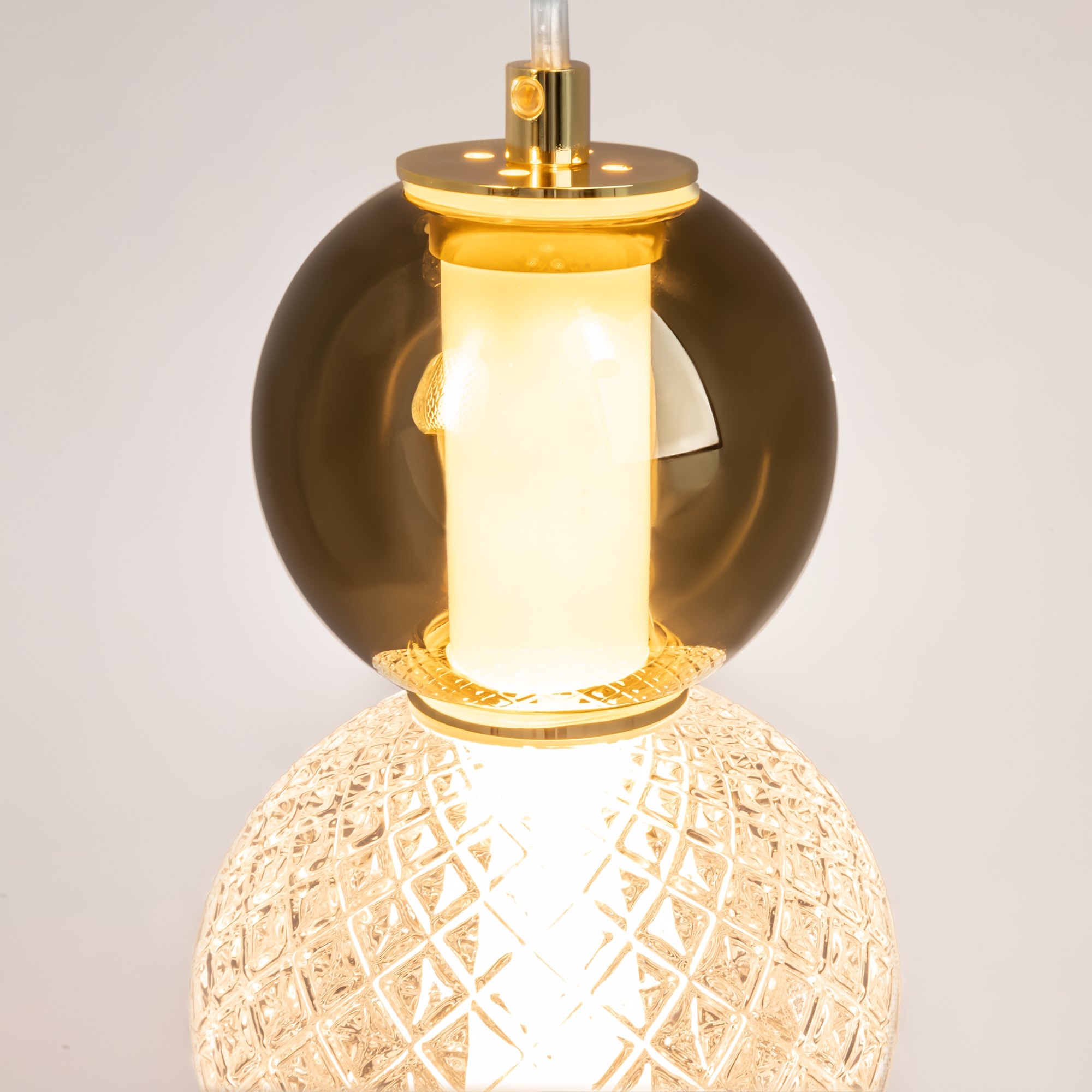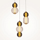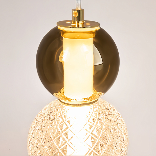 Материал арматуры - металл, цвета - золото, хром. Микс плафонов: гладкие cферы коньячного или дымчатого оттенка + округлые рельефные с ромбовидным узором из прозрачного стекла. Регулируемая высота подвесных моделей - максимальная длина провода 3 метра. LED-источник света, цветовая температура 3000К