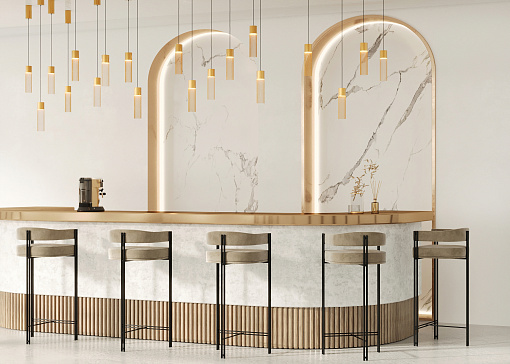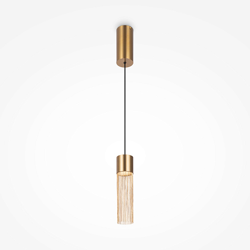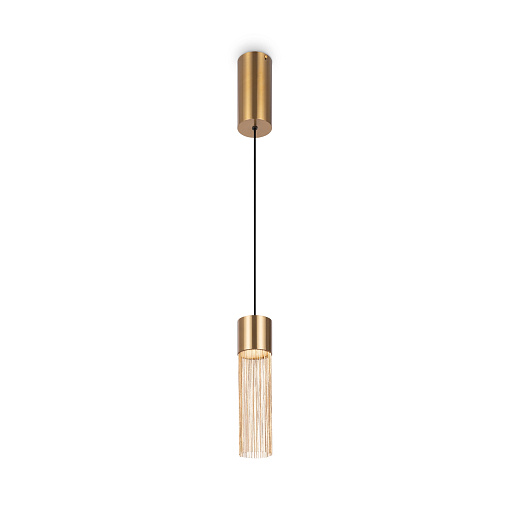 Металлическая арматура, цвет - золото. Мотивы ювелирного искусства в дизайне. Изящные цепочки на корпусе светильника создают переливы бликов. LED источник света. Цветовая температура - 3000К. Регулируемая высота подвесного светильника.