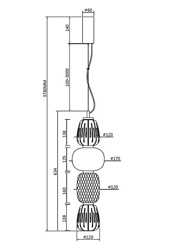 Металлическая арматура, цвет - золото, хром. Микс плафонов округлых и вытянутых форм из белого  матового и прозрачного стекла с сетчатым и с линейным повторяющимся рельефным рисунком. Регулируемая высота подвесных моделей, провод - 3 метра. LED-источник света, цветовая температура  3000К.