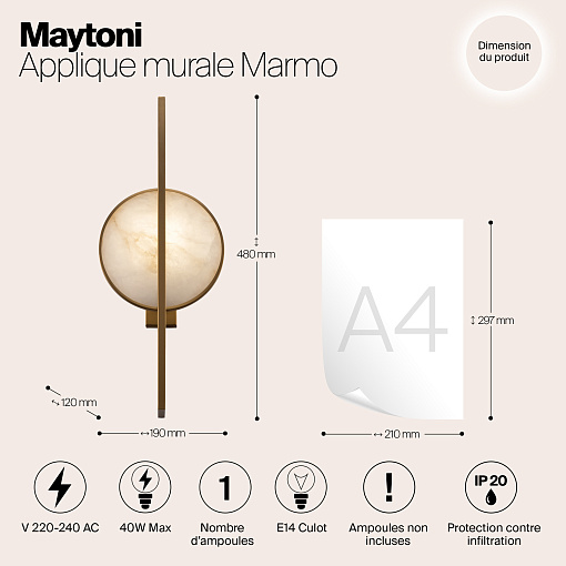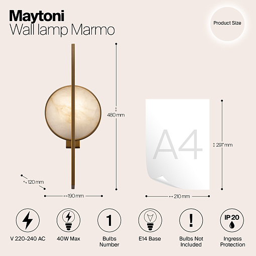 Металлическая арматура гальванизирована в цвет золота. Декор – пластины из натурального камня с текстурным рисунком. Сочетание прямоугольных линий и округлых элементов в дизайне. Цоколь Е14.