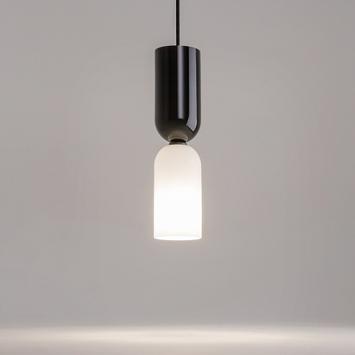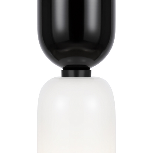 Металлическая арматура, цвет - черный. Светильники стилизованы под форму песочных часов с обтекаемой формой. Керамические элементы с глянцеовй глазурью. Подвесные светильники с плафонами из белой керамики с прозрачным, черно-белым, золото-белым и белым стеклом. Регулируемая высота подвесных светильников.