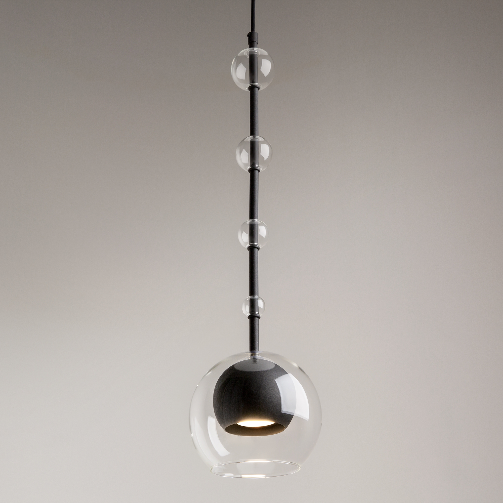 Арматура - металл, плафоны - стекло. Цветовый комбинации арматуры и плафона: черный + прозрачный, черный + янтарный, латунь + прозрачный. Элементы декора - выдувные бусины" из стекла. Высота проводов регулируется. Источник света - лампа с цоколем GU10.