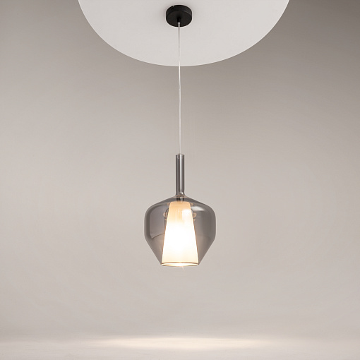 Металлическое основание, цвет — черный. Двойные стеклянные плафоны. Многообразные геометрические формы плафонов. Цвет стекла: зеркальный золотой, кофейный и дымчатый, а также градиентный белый. Регулируемая длина провода — 3 метра. Источник света — лампа с цоколем Е27.