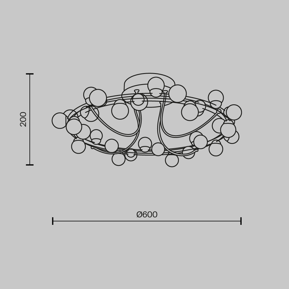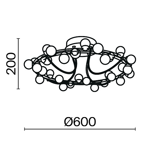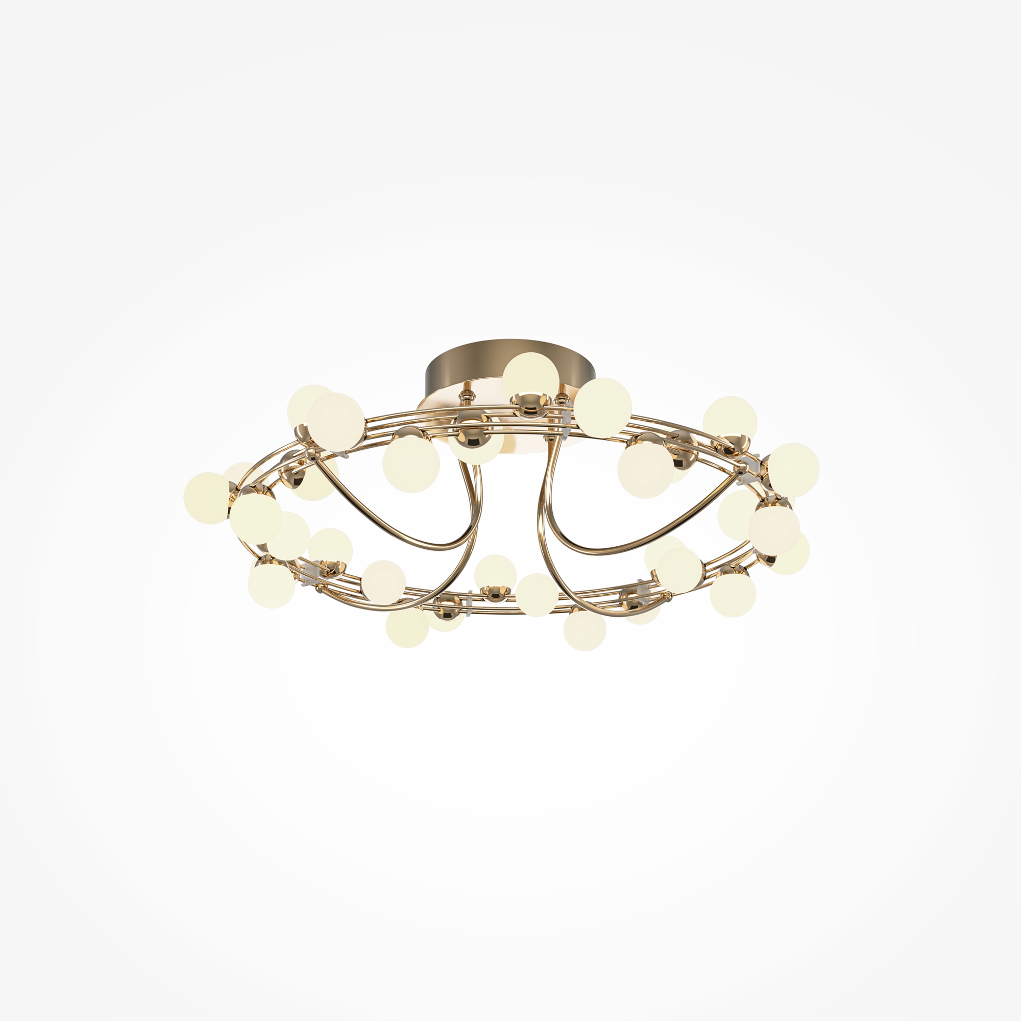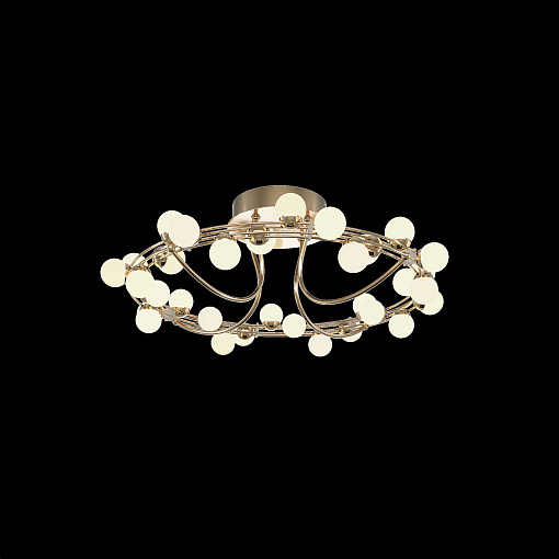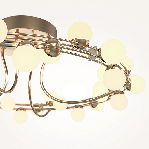 Арматура из металла в золотом цвете. Плафоны-сферы — белый пластик. Дизайн с имитацией молекулярной структуры. LED-источники света.