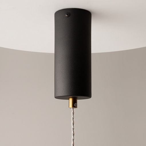Черная потолочная чаша дополнена финишным антибликовым покрытием sandy, декоративный элемент плафона выполнен из металла цвета сатинированной латуни. Сочетание двух фактурных стекол в плафоне: нижняя полусфера из матового белого стекла для создания мягкого рассеянного  света, верхняя часть плафона - из тонированного янтарного стекла. Внутри установлен LED-модуль, создающий равномерное освещение, направленное вверх и вниз. Цветовая температура – 3000К, угол рассеивания — 120°.