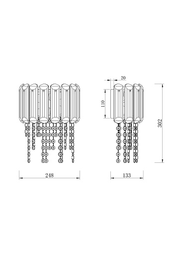 Арматура из металла, цвет – хром. Прозрачный хрустальный декор двух видов: крупный вытянутый по внешнему периметру и округлый на подвесках. Высота подвесных моделей регулируется. Цоколь Е14.