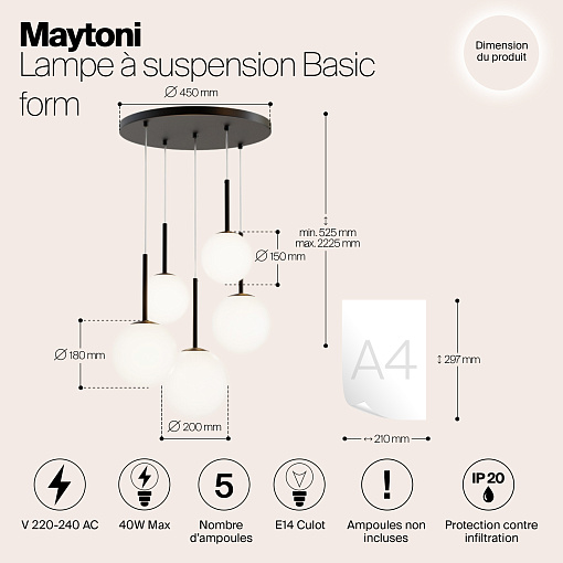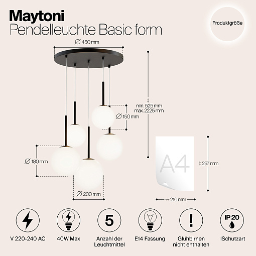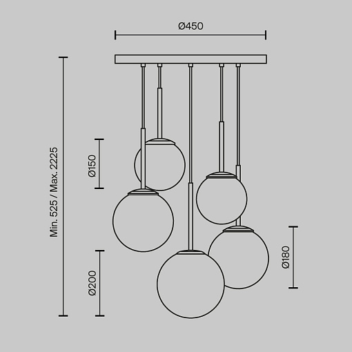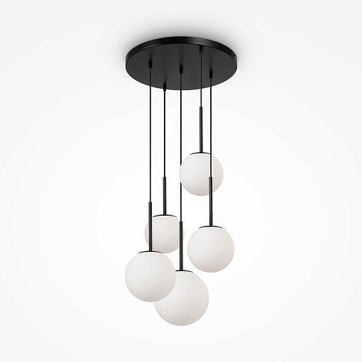 Материал арматуры – металл, цвет - золото, белый, черный. Округлые плафоны из матового белого стекла. Универсальные формы, минималистичный дизайн. Цоколь - E14. Лампы не входят в комплект. Регулируемая высота подвесных светильников.