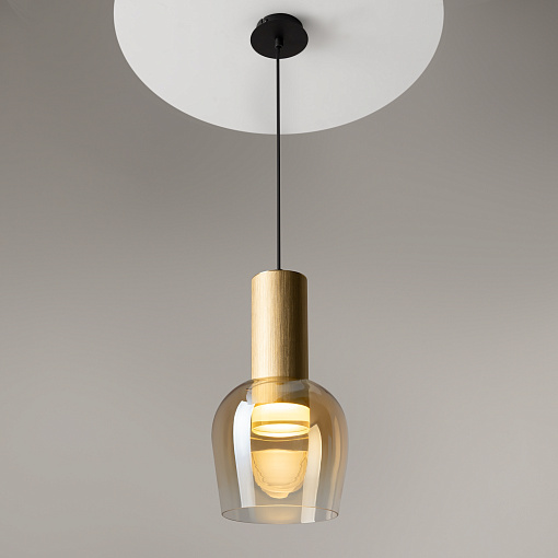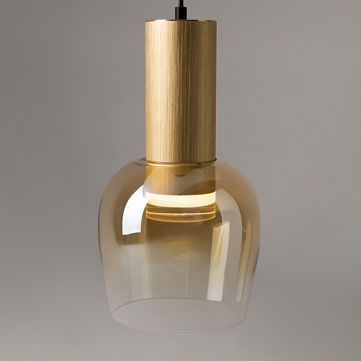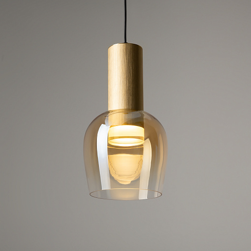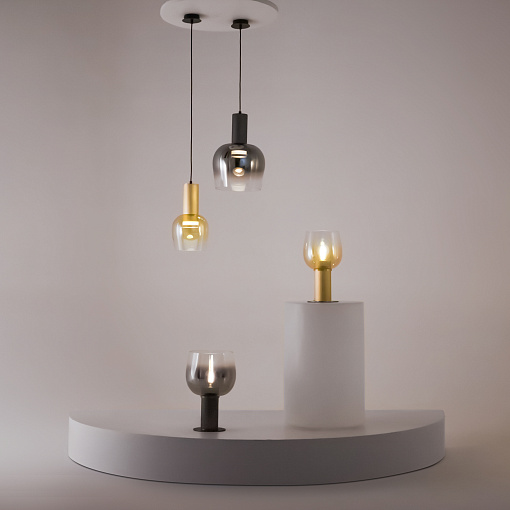 Цветовая гамма: дымчато-серый или насыщенно-янтарный цвет стекла в сочетании с черной или золотой арматурой. В серии есть модели светильников со сменным источником света с цоколем Е27 (каскадная композиция, потолочный и настольные светильники) и LED-источником (одинарные подвесные светильники). Температура свечения LED – 3000 К, угол рассеивания — 120 градусов. Плафоны каскадной композиции плафоны разных размеров и оттенков, установленные на одно основание. Оригинальный декор — актуальный вариант современной классики.