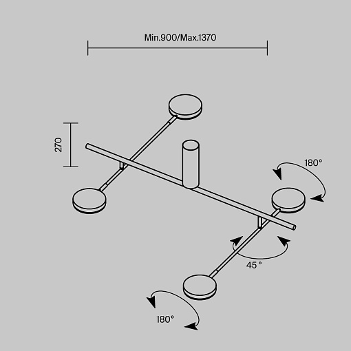 Плафоны и арматура из металла. Цвет рассеивателя — белый, арматура черная или белая. Конструкция предусматривает шарнирный механизм, позволяющий регулировать направление света и высоту светильников. Плафоны вращаются на 90 и 360° (в вертикальной и горизонтальной плоскостях). Угол рассеивания — 120 градусов. Тип света — рассеянный.