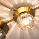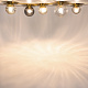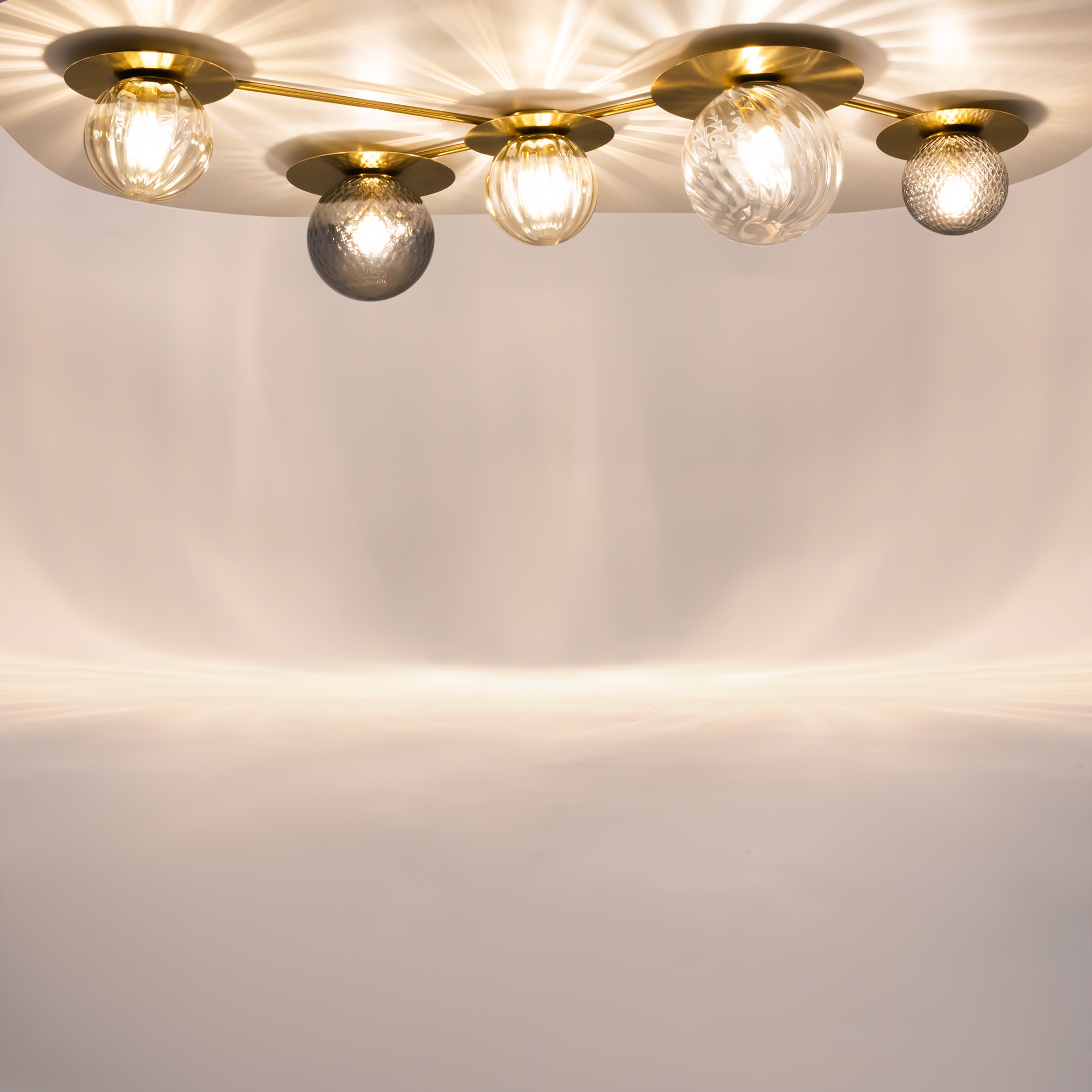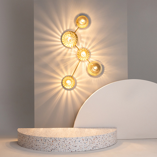 Компактное металлическое основание и  арматура цвета латуни. Две модели с плафонами белого цвета и две с разноцветными плафонами: серый, прозрачный, дымчатый и оттенка коньяка. Источник света: цоколь Е14. Компактное основание светильника прилегает к потолку. Функциональное основное освещение. Местоположение разноцветных плафонов можно менять, создавая композиции по своему вкусу. Поверхность плафонов имеет орнамент, при включении светильника на потолке создаются узоры.