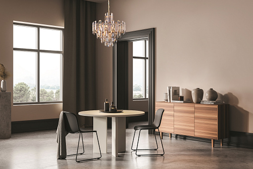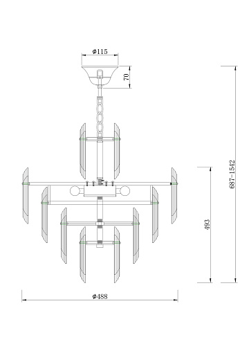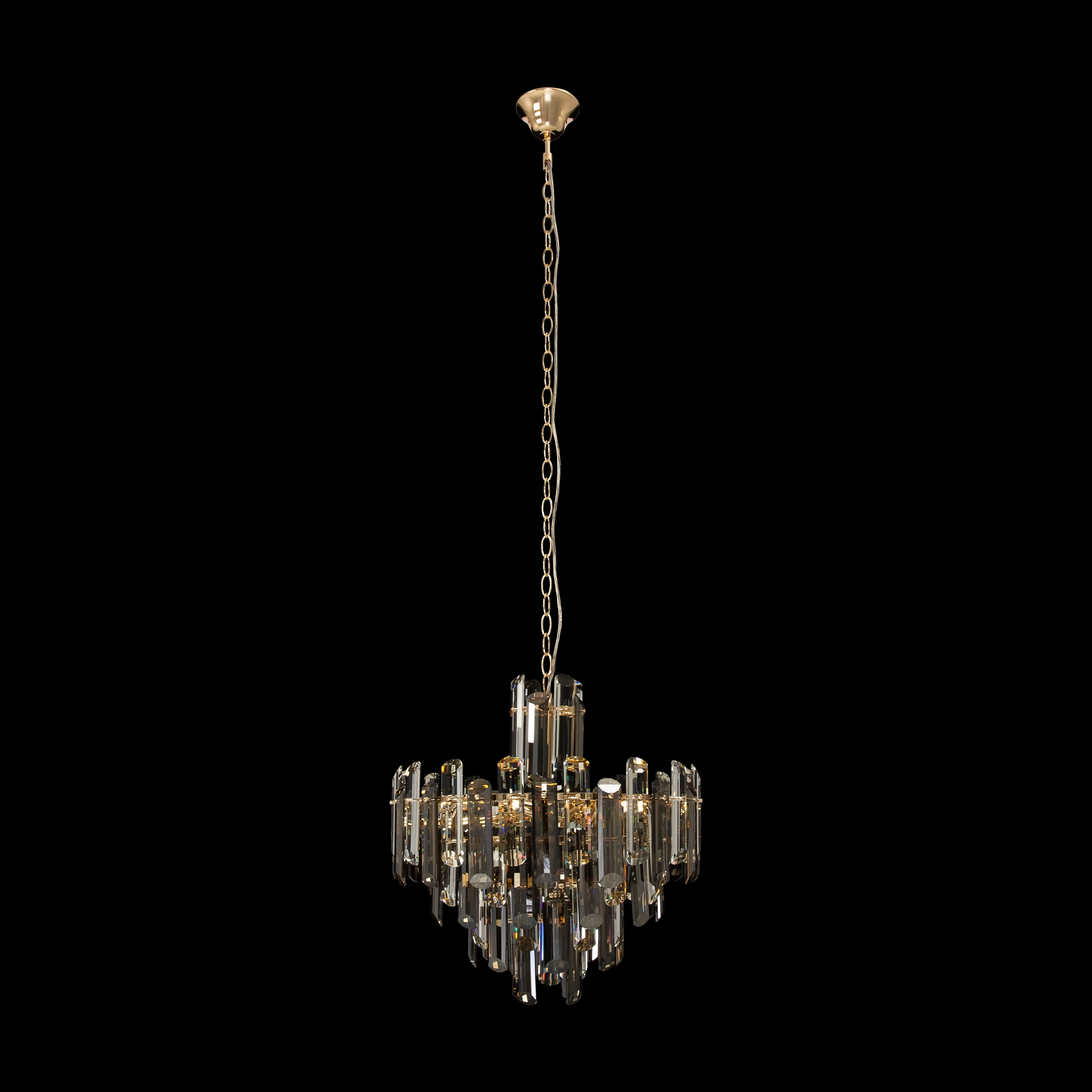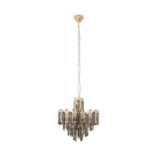 Материал арматуры – металл, цвет – золото. Декор – хрусталь крупной архитектурной огранки. Высота подвесных люстр регулируется цепью. Источник света – лампы с цоколем Е14.