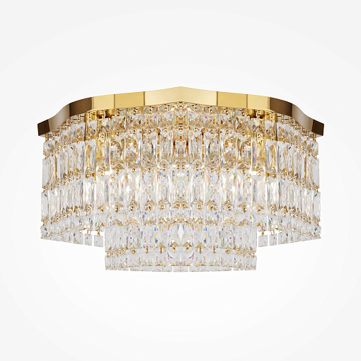 Металлическая арматура в двух оттенках: хром, золото. Декор – прозрачные кристаллы. Потолочные модели имеют два яруса подвесок. Высота подвесной люстры регулируется тросом.