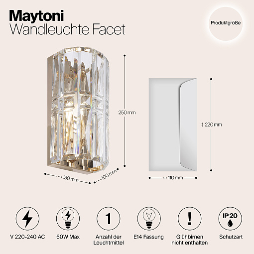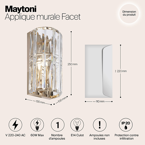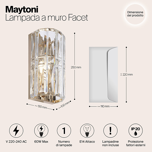 Материал арматуры – металл, оттенки – хром и золото. Декор – прозрачные стек лянные кристаллы. Архитектурная огранка декоративных элементов. Цоколь Е14.
