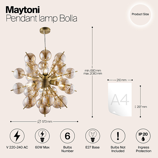 Арматура – металл, оттенки – хром, латунь. Плафоны-сферы из выдувного стекла. Гальваническое покрытие плафонов в двух оттенках: янтарный и дымчатый цвет.