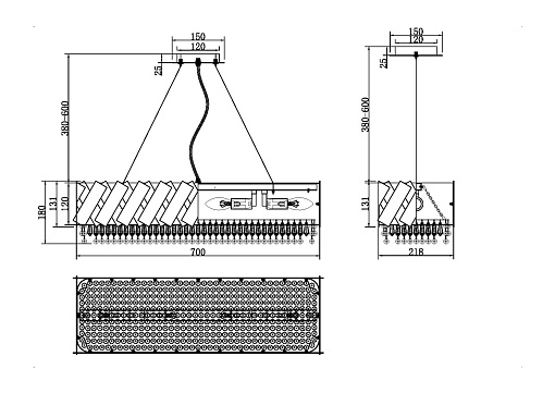 Арматура – нержавеющая сталь, цвет – латунь. Комбинация фактурных и гладких металлических пластин в декоре. Стеклянные подвески обрамляют источники света.