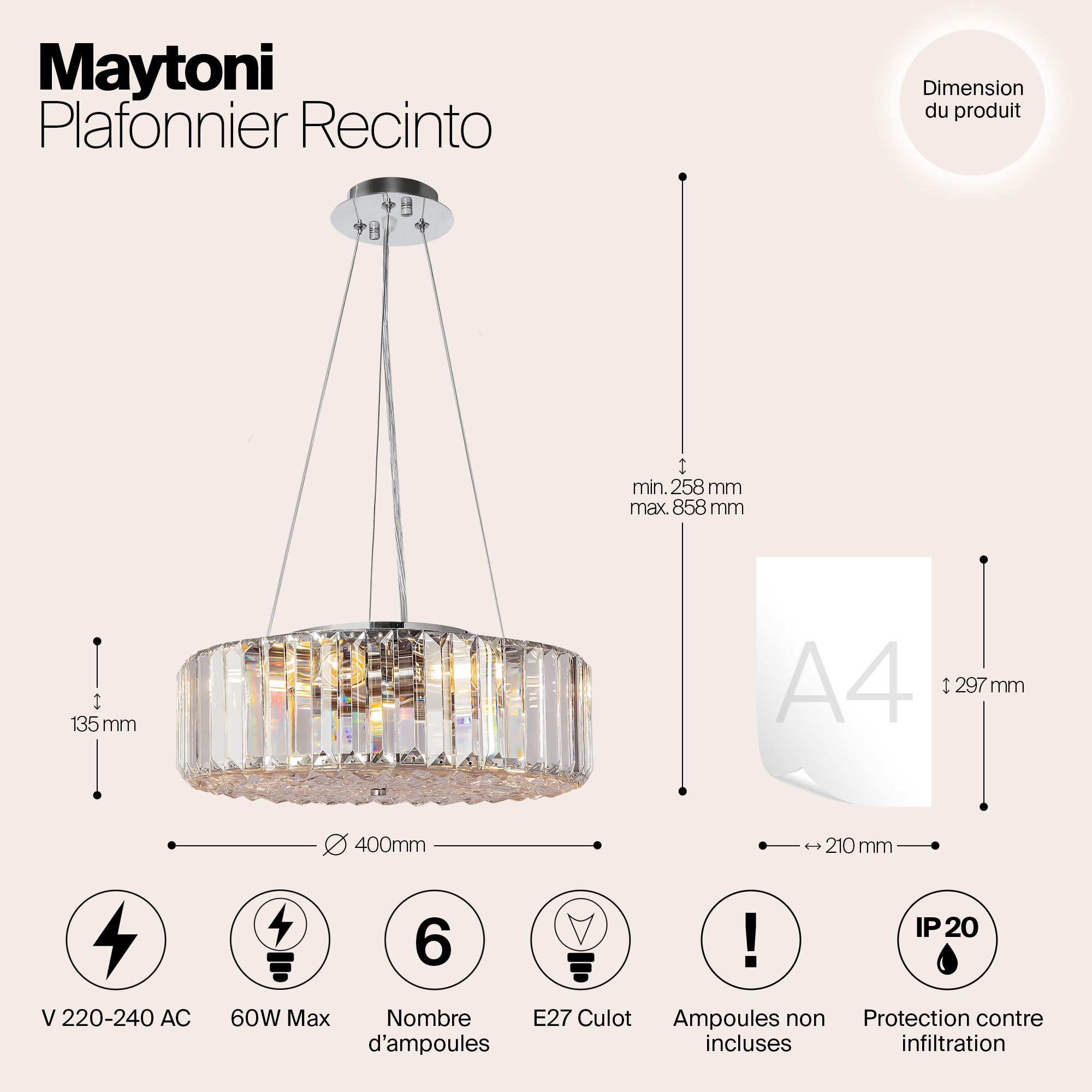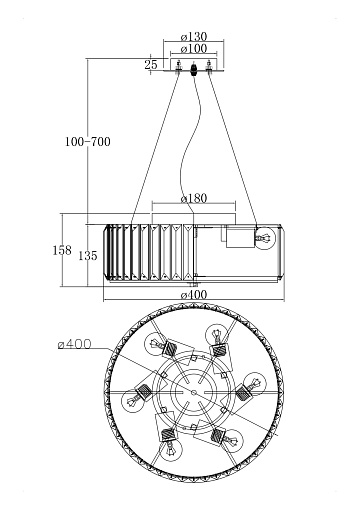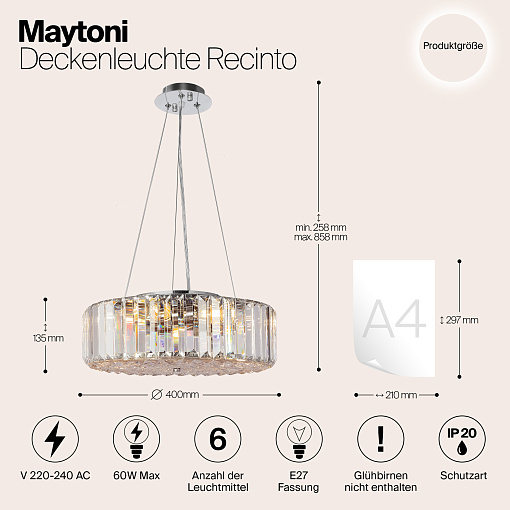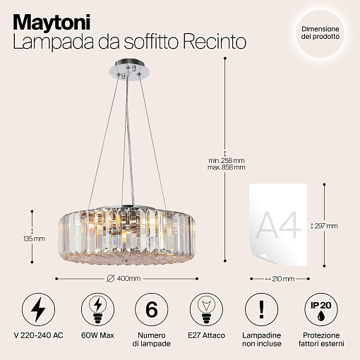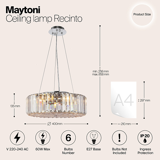 Металлическая арматура, цвет – хром. Декор – прямоугольные хрустальные пла стины. Источники света скрыты под фактурным стеклом. Высота светильников регулируется тросом.