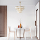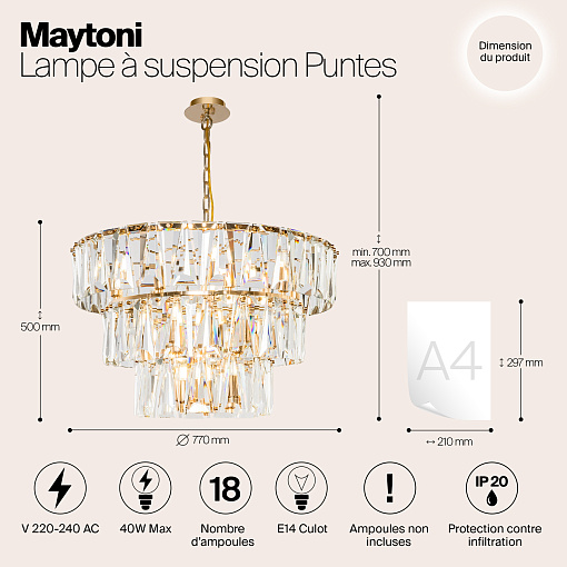 Материал арматуры – металл, оттенки – хром и золото. Декор – массивные крис таллы сложной огранки. Высота подвесных моделей регулируется длиной цепи. Источник света - лампа с цоколем Е14.