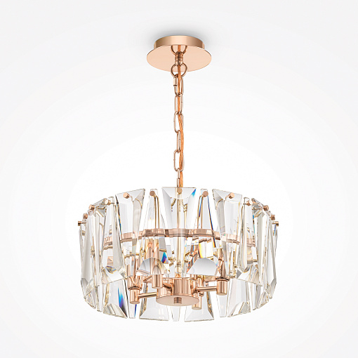 Материал арматуры – металл, оттенки – хром и золото. Декор – массивные крис таллы сложной огранки. Высота подвесных моделей регулируется длиной цепи. Источник света - лампа с цоколем Е14.