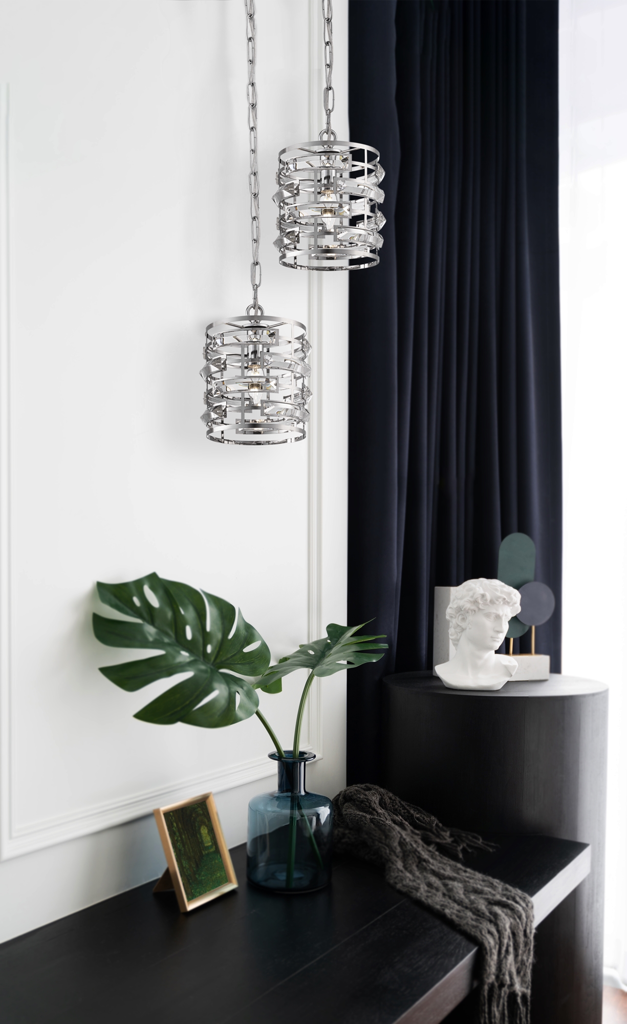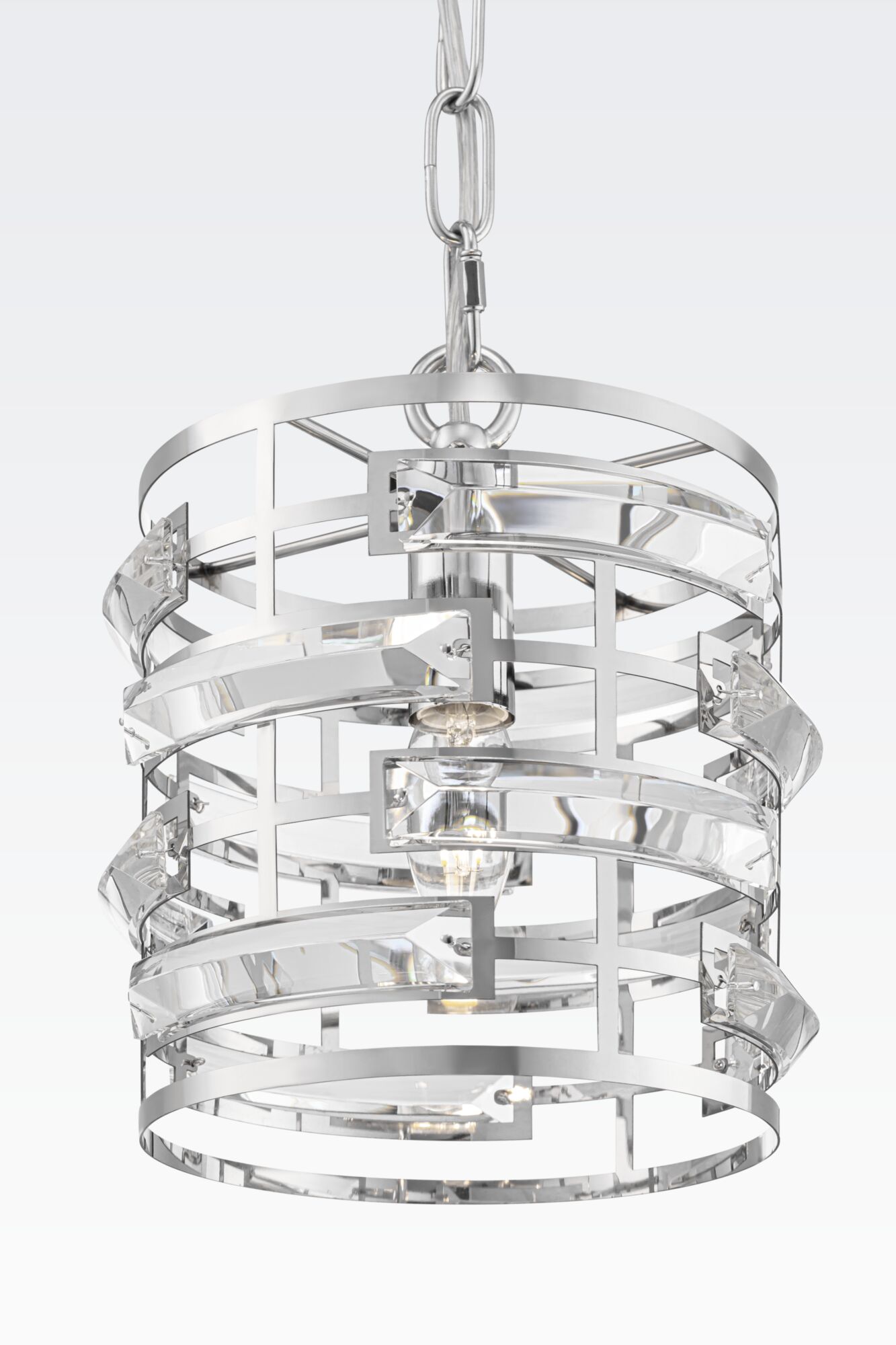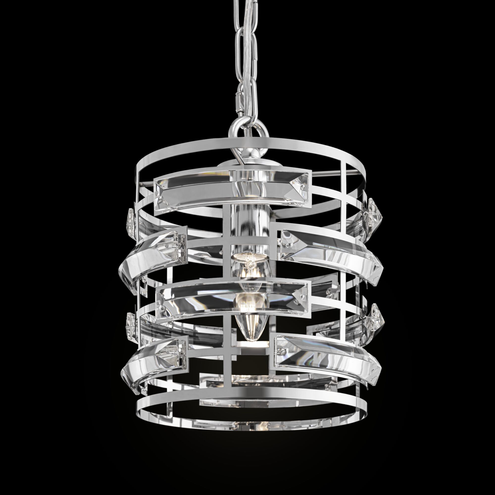 Арматура из нержавеющей стали, цвет арматуры – хром. Металлический каркас абажура декорирован прозрачным хрусталем. Высота подвесных моделей регу лируется.