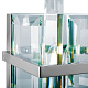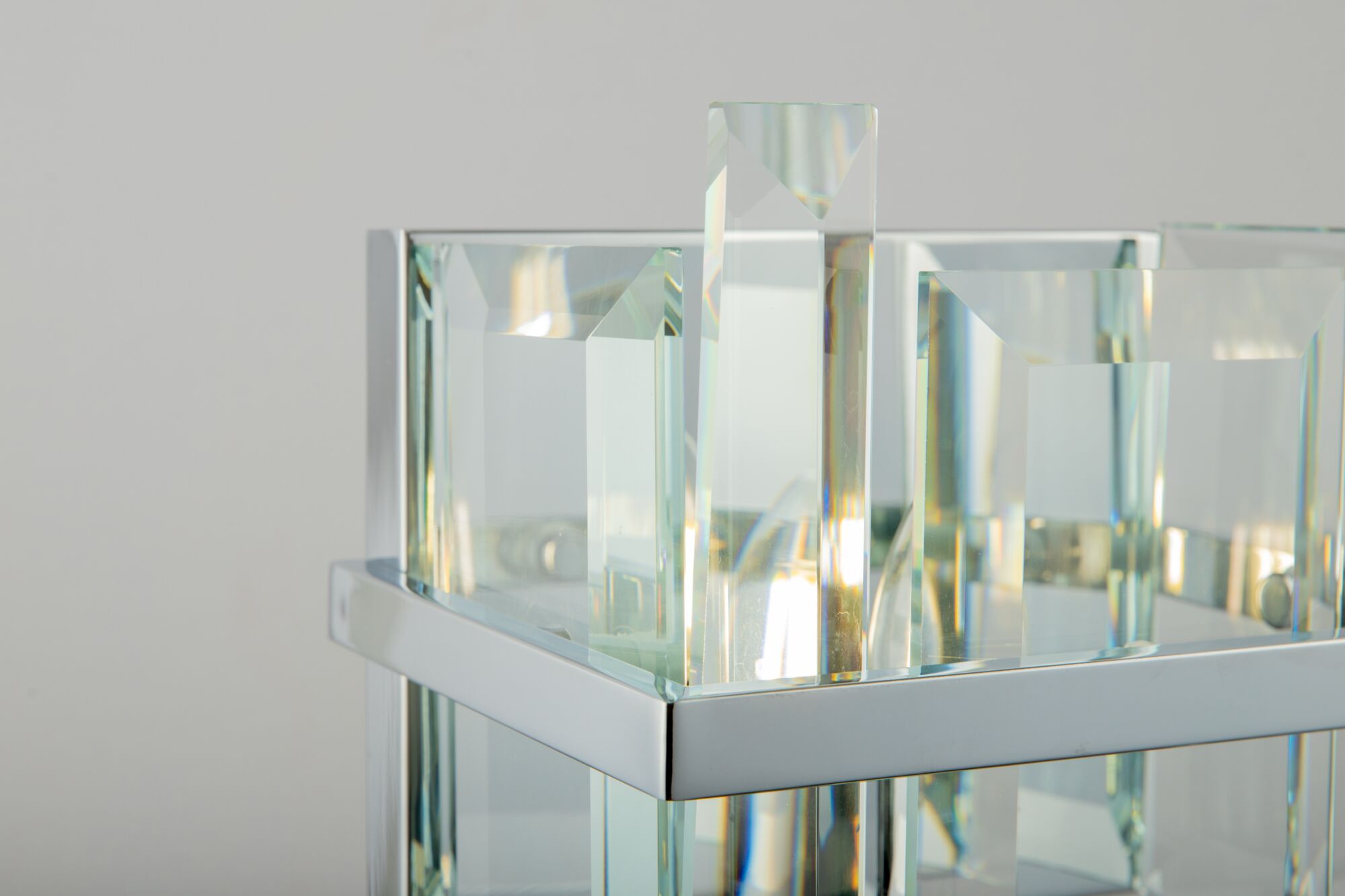 Арматура из металла, цвет – хром. Плафон составляют пластины из прозрачного оптического стекла. Металлический каркас плафона окрашен в тон арматуре. Высота подвесных моделелей регулируется.