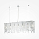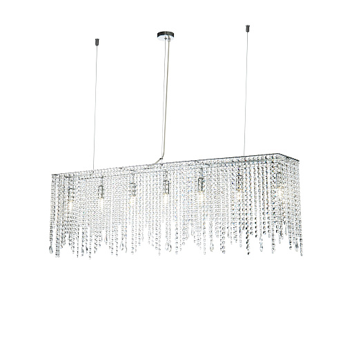 Арматура из металла в цвете хром. Декор – подвески из прозрачного хрусталя. Оригинальная прямоугольная форма. Высота светильников регулируется тросом.