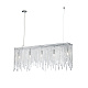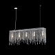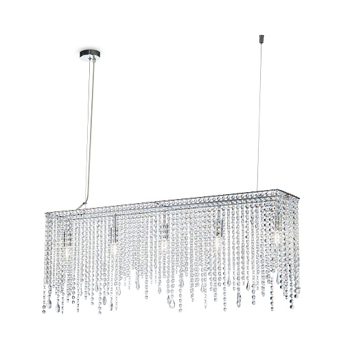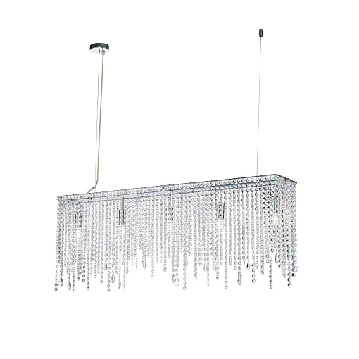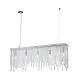 Арматура из металла в цвете хром. Декор – подвески из прозрачного хрусталя. Оригинальная прямоугольная форма. Высота светильников регулируется тросом.