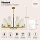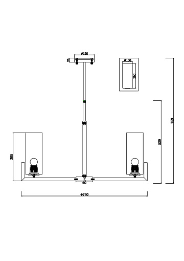 Арматура из металла, оттенок — латунь. Стеклянные плафоны в белом цвете. Часть элементов окрашена в контрастный черный оттенок. Геометрия в дизайне: цилиндрические плафоны, прямоугольные рожки.