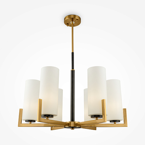 Арматура из металла, оттенок — латунь. Стеклянные плафоны в белом цвете. Часть элементов окрашена в контрастный черный оттенок. Геометрия в дизайне: цилиндрические плафоны, прямоугольные рожки.