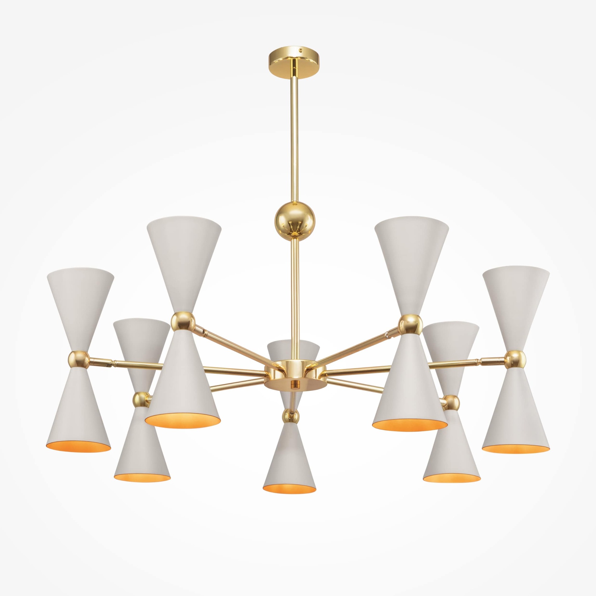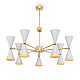 Материал арматуры - металл, оттенок – золото. Металлические плафоны изнутри окрашены в золотой цвет, снаружи в двух вариантах: черный и белый. Поворотный механизм, рожки вращаются. Источник света - лампа с цоколем Е14.