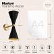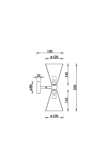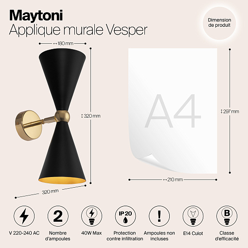 Материал арматуры - металл, оттенок – золото. Металлические плафоны изнутри окрашены в золотой цвет, снаружи в двух вариантах: черный и белый. Поворотный механизм, рожки вращаются. Источник света - лампа с цоколем Е14.