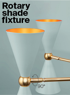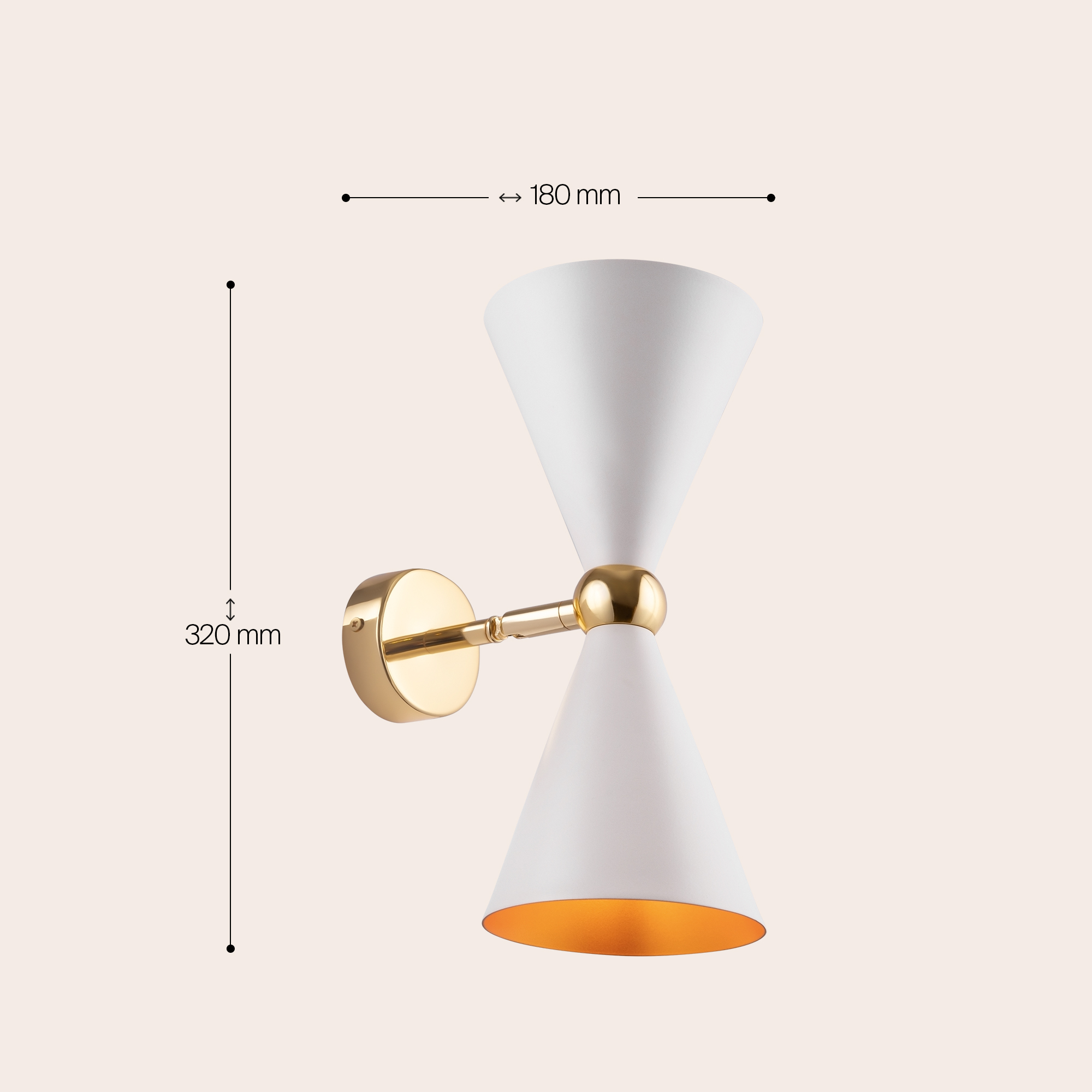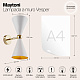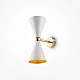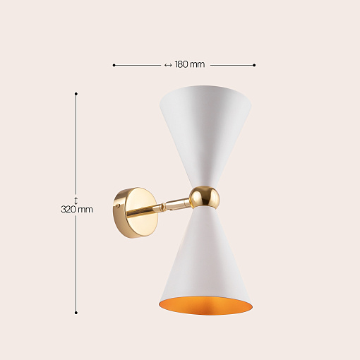 Материал арматуры - металл, оттенок – золото. Металлические плафоны изнутри окрашены в золотой цвет, снаружи в двух вариантах: черный и белый. Поворотный механизм, рожки вращаются. Источник света - лампа с цоколем Е14.