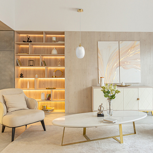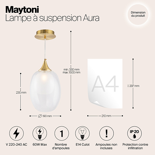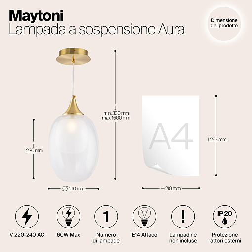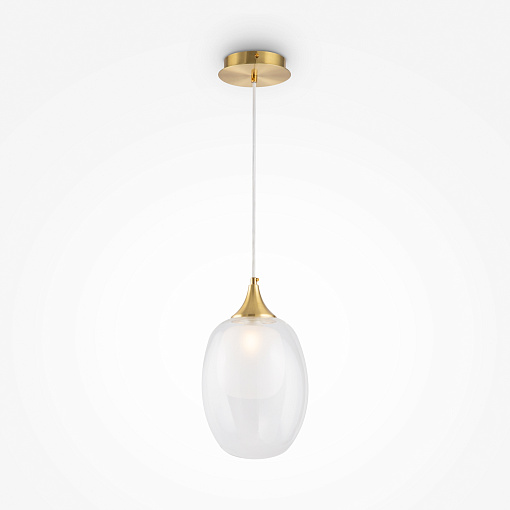 Металлическая арматура, цвет — латунь. Плафоны — двойное выдувное стекло. Внутренняя часть – матовая, внешняя – прозрачная. Элегантная неоклассика, трендовые округлые формы. Прозрачный провод длиной 3 метра подходит для помещений с высокими потолками. Регулируемая высота светильника для удобного размещения.