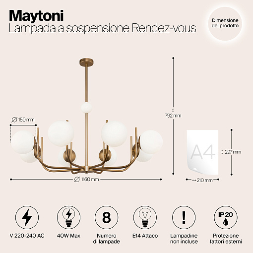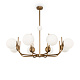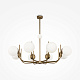 Арматура из металла окрашена в цвет латуни. Плафоны-сферы из матового белого стекла. Трендовые обтекаемые формы. Дизайн в стиле ретро. Источник света — лампы с цоколем Е14.