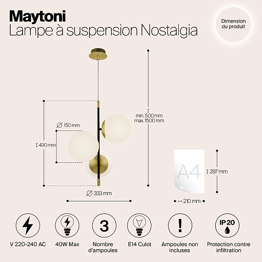 Арматура из металла в цвете матового золота. Плафоны-сферы из матового выдувного стекла. Модная асимметрия в дизайне. Источник света — лампы с цоколем Е14.