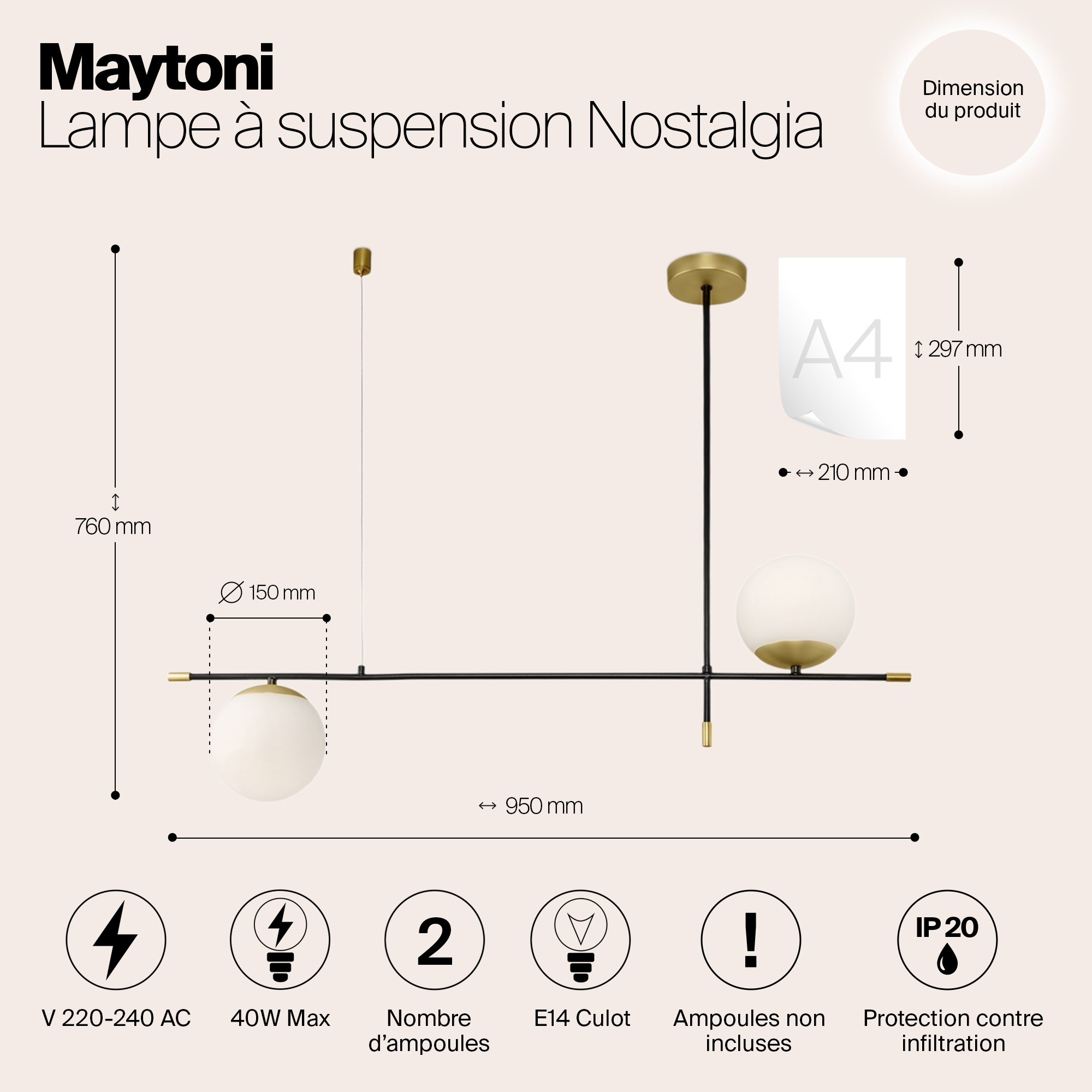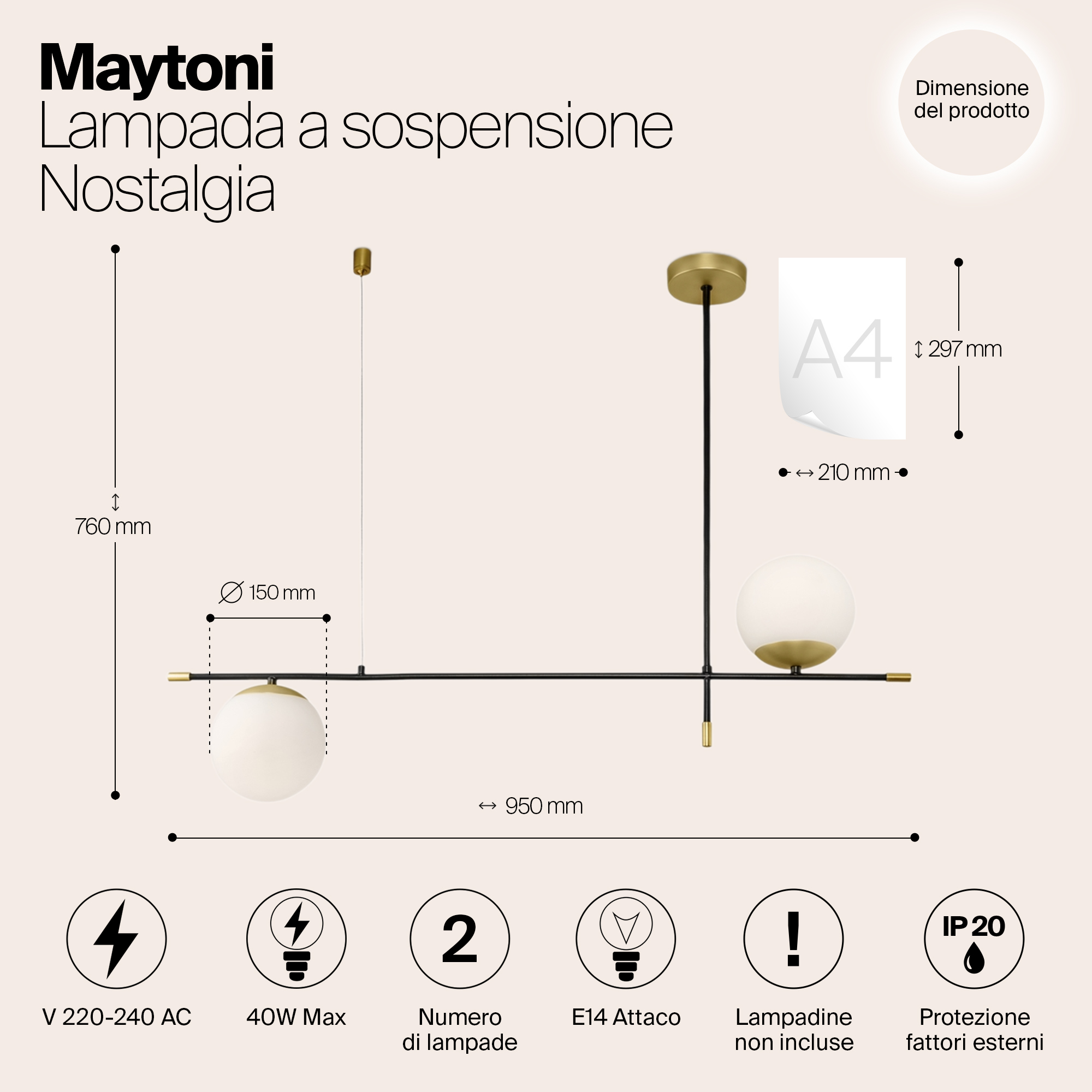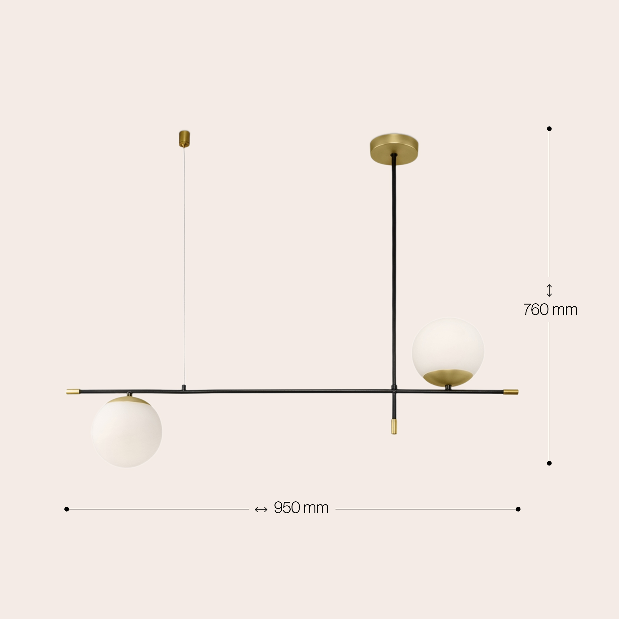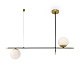 Арматура из металла в цвете матового золота. Плафоны-сферы из матового выдувного стекла. Модная асимметрия в дизайне. Источник света — лампы с цоколем Е14.