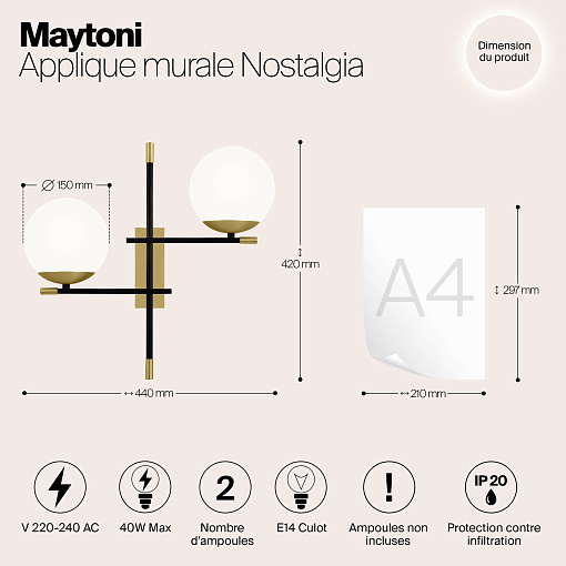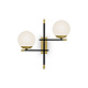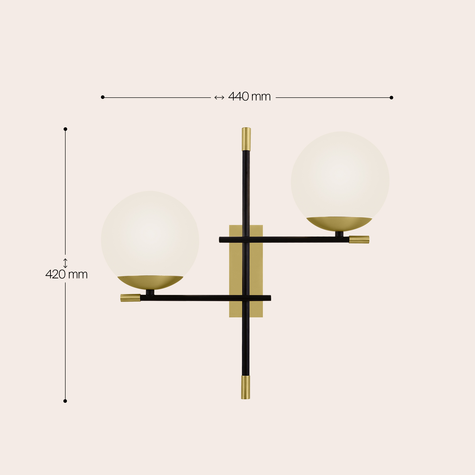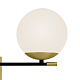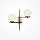 Арматура из металла в цвете матового золота. Плафоны-сферы из матового выдувного стекла. Модная асимметрия в дизайне. Источник света — лампы с цоколем Е14.