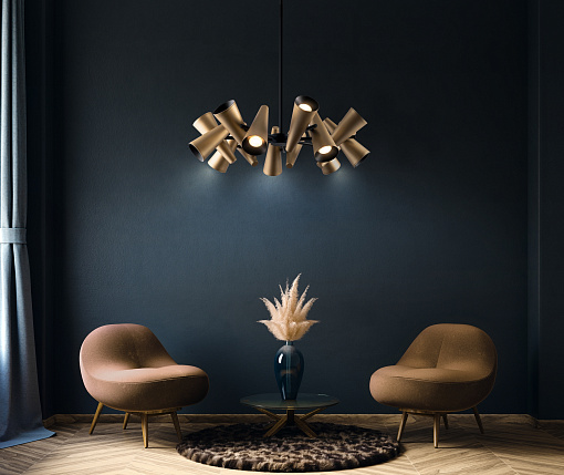 Металлическая арматура в двух оттенках: белый и черный. Плафоны-конусы выполнены из алюминия. Оттенки: белый, латунь. Рожки вращаются, можно менять направление света. Высота регулируется с помощью разборного центрального элемента.