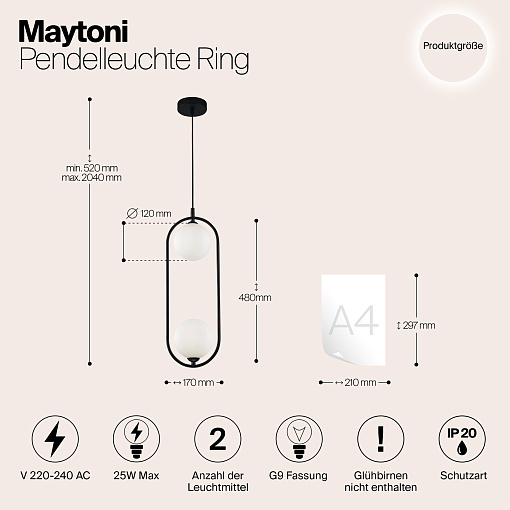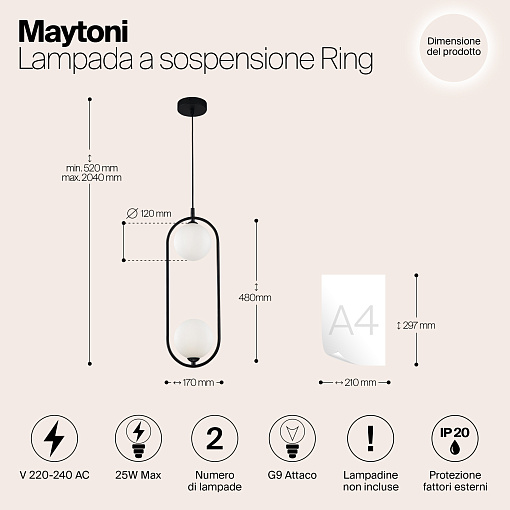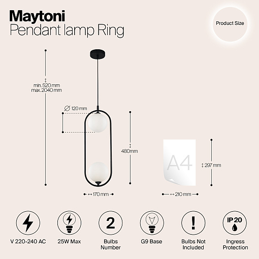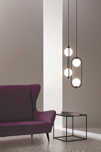 Арматура из металла в трех оттенках: белый, черный, латунь. Плафоны-сферы закреплены на округлом металлическом каркасе. Материал плафонов — выдувное стекло, цвет — белый. Высота подвесных моделей регулируется.