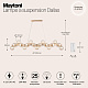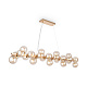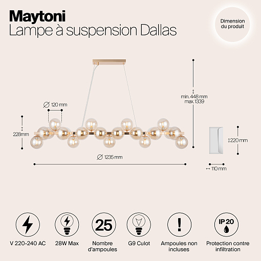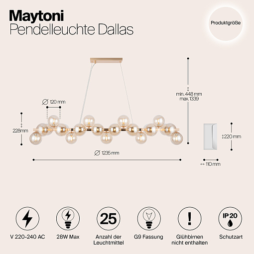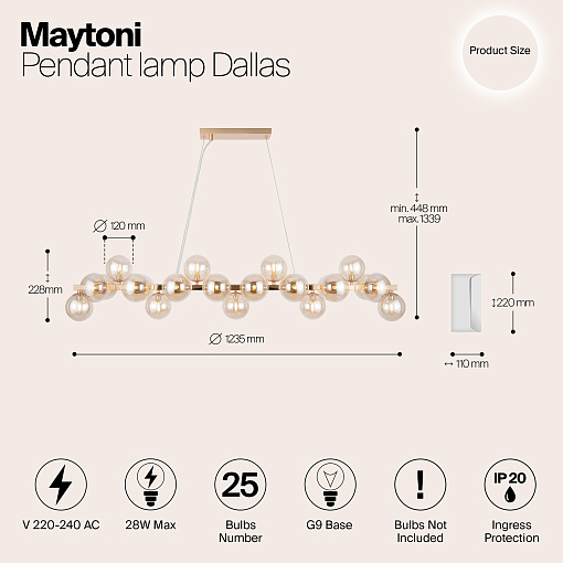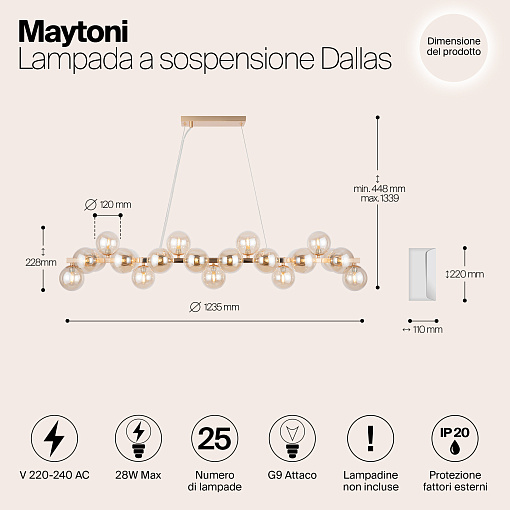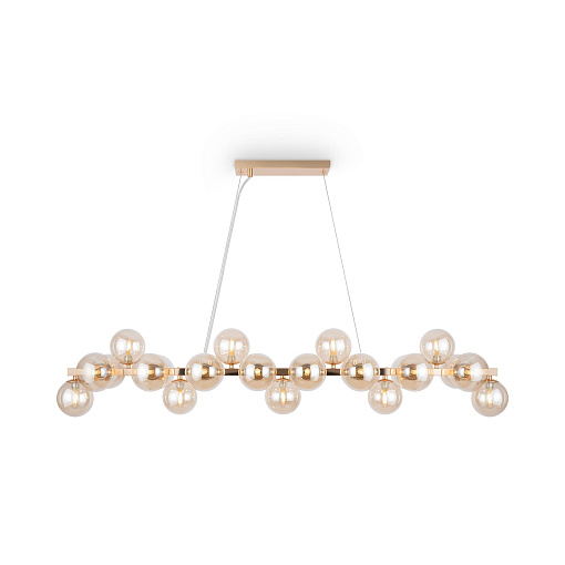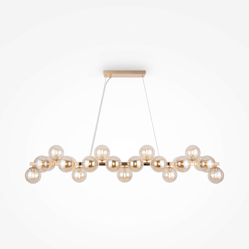 Металлическая арматура в четырех цветах: матовый черный, хром, золото, латунь. Плафоны — выдувное стекло. Цвета — дымчатый, янтарный, коньячный. Дизайн с имитацией молекулярной структуры. Высота подвесных светильников регулируется тросом. Лампа с цоколем G9.