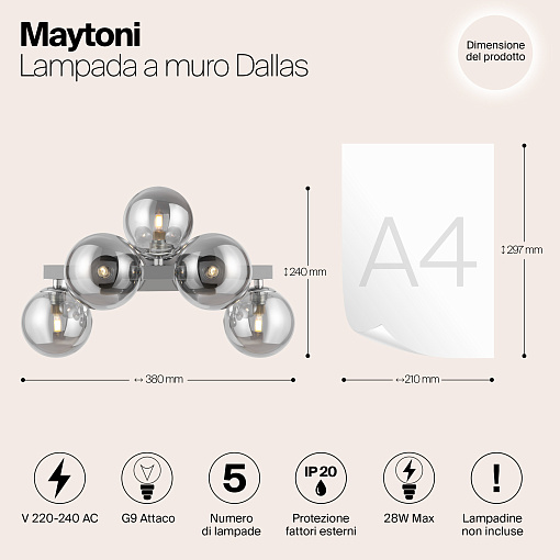 Металлическая арматура в четырех цветах: матовый черный, хром, золото, латунь. Плафоны — выдувное стекло. Цвета — дымчатый, янтарный, коньячный. Дизайн с имитацией молекулярной структуры. Высота подвесных светильников регулируется тросом. Лампа с цоколем G9.