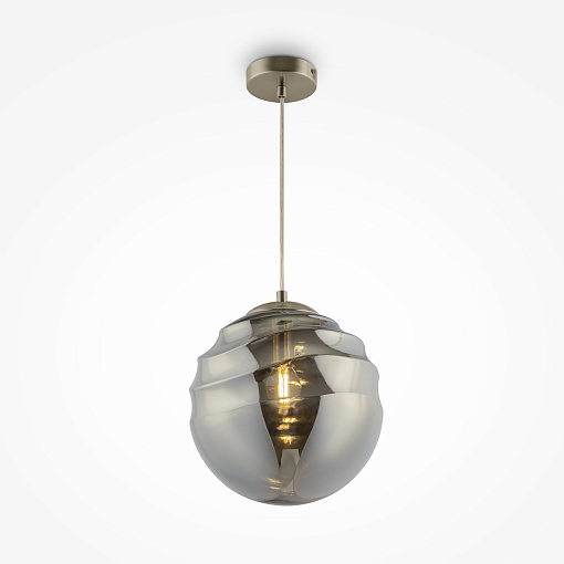 Арматура из металла в двух оттенках: латунь и никель. Декоративный плафон оригинальной рельефной формы. Материал плафона – тонированное стекло, оттенки – дымчатый и янтарный. Регулируемая высота.