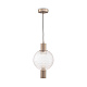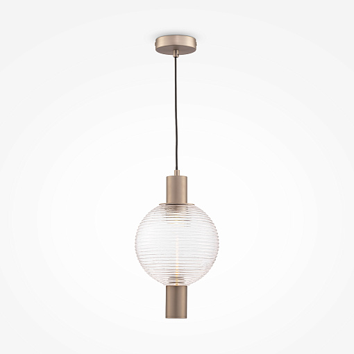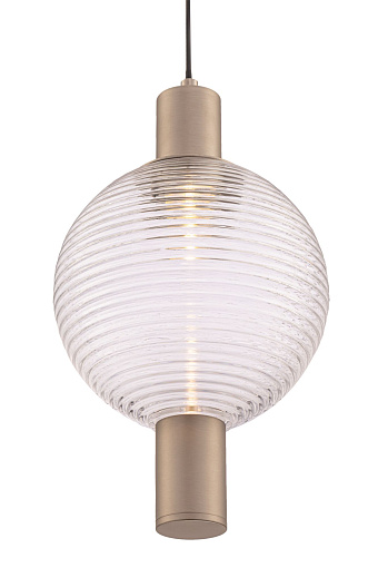 Арматура из металла, оттенки – никель, латунь, матовый черный. Плафон-сфера из прозрачного стекла с рельефным рисунком. Источник света установлен в металлическом корпусе сверху. Регулируемая высо