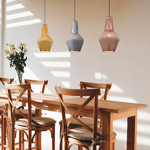 Арматура из металла в черном цвете. Фактурный плафон с рельефным рисунком, материал – выдувное стекло. Высота светильников ре