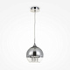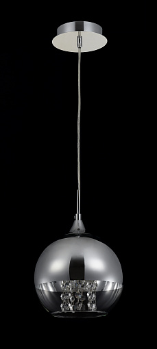 Арматура из металла в двух оттенках: никель и золото. Часть плафона выполнена из металла в тон арматуре, другая часть — из прозрачного стекла. Декоративные подвески внутри плафонов. Регулируемая высота.