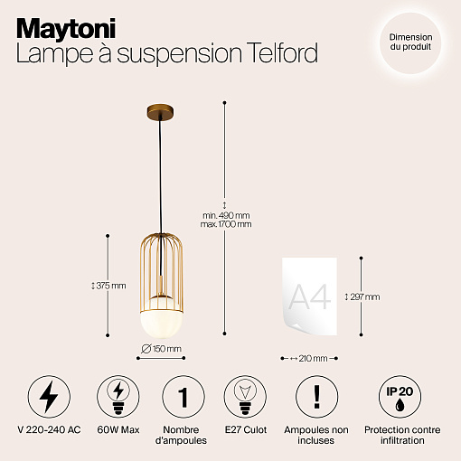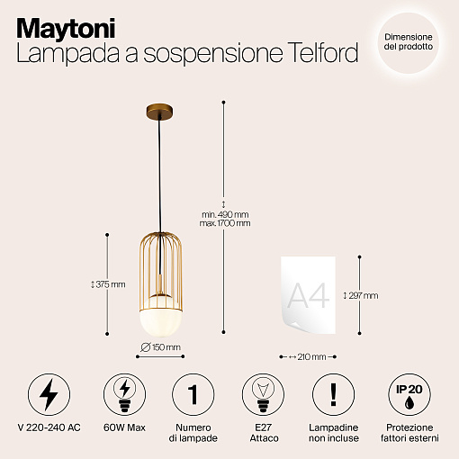 Арматура из металла в золотом цвете. Плафон из матового белого стекла. Декор плафона Telford — решетка из стальной проволоки в тон арматуре. Регулируемая высота.