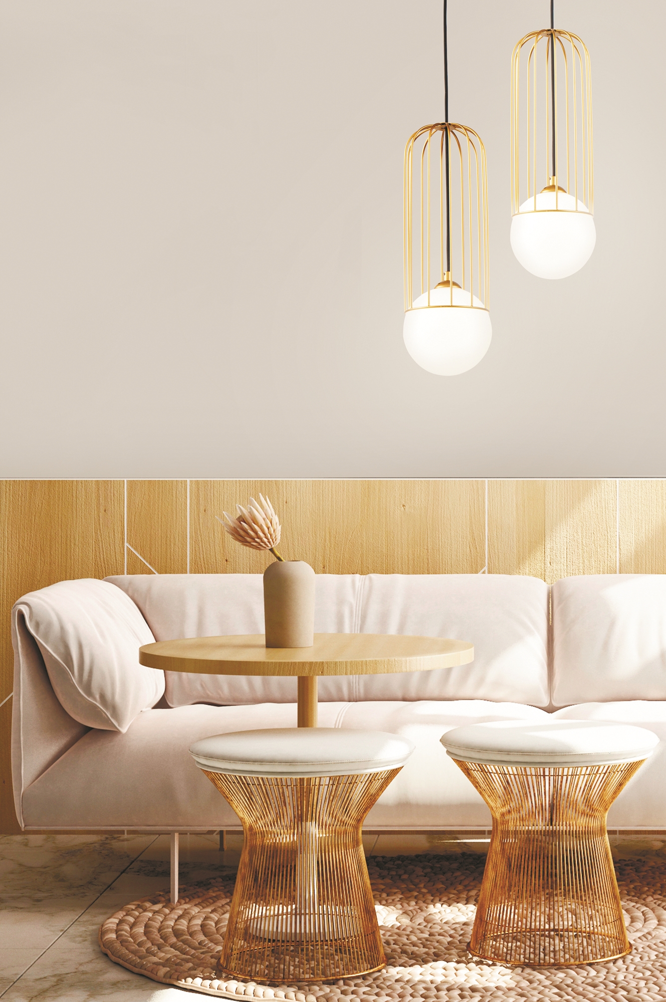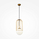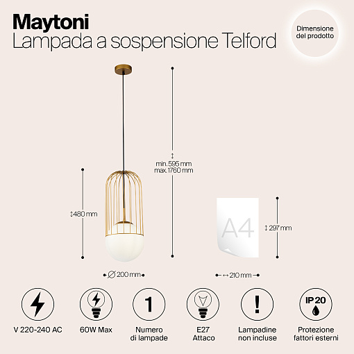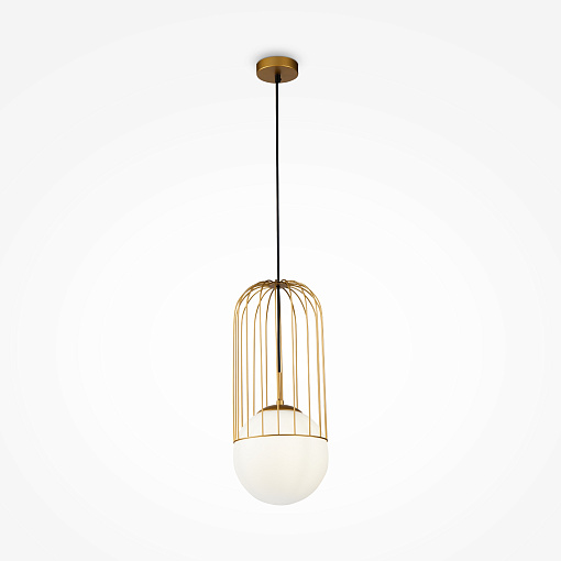Арматура из металла в золотом цвете. Плафон из матового белого стекла. Декор плафона Telford — решетка из стальной проволоки в тон арматуре. Регулируемая высота.
