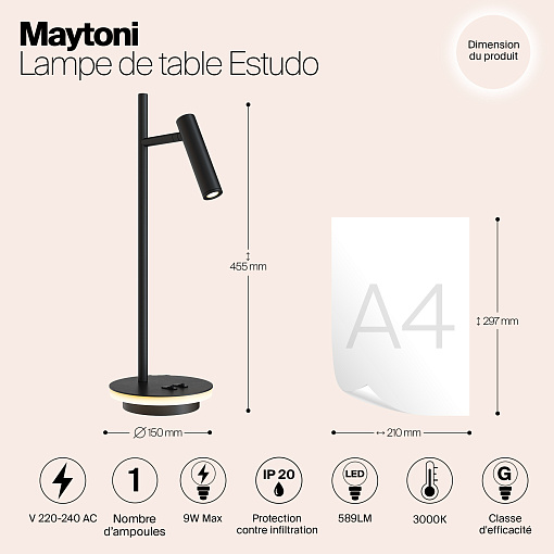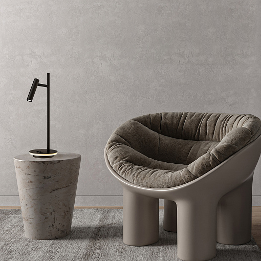 Металлический корпус в черном и белом оттенках. Вращающийся плафон-цилиндр позволяет регулировать направление светового потока. Декоративная подсветка основания. LED источник света, цветовая температура 3000К.