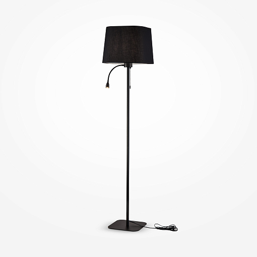 Металлическая арматура в белом и черном цвете. Материал абажура – текстиль, нанесенный на ПВХ, оттенки – белый и черный. LED-элемент для локальной под светки расширяет функционал модели.